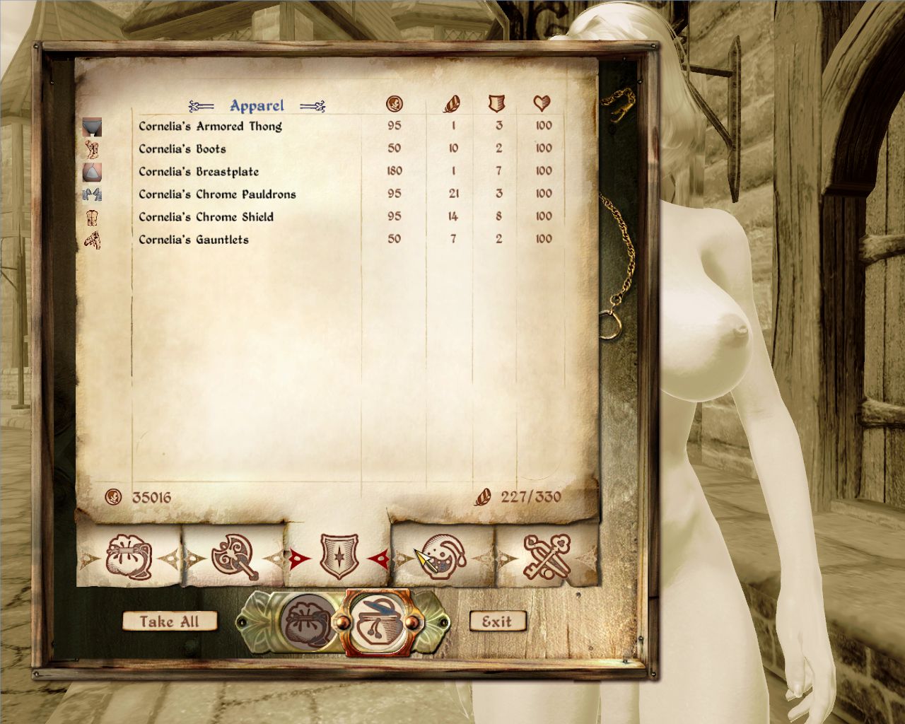 When I first included the LAPF framework and some of its children mods in my setup, it had to reconsider Cornelia's roleplay entirely. A stainless Knight with 0 infamy doesn't mix too well with LAPF, particularly when you install Bravil Underground and Lovers Slave Trader. I had to convince her to step down from her adamantine pedestal and get her hands dirty.