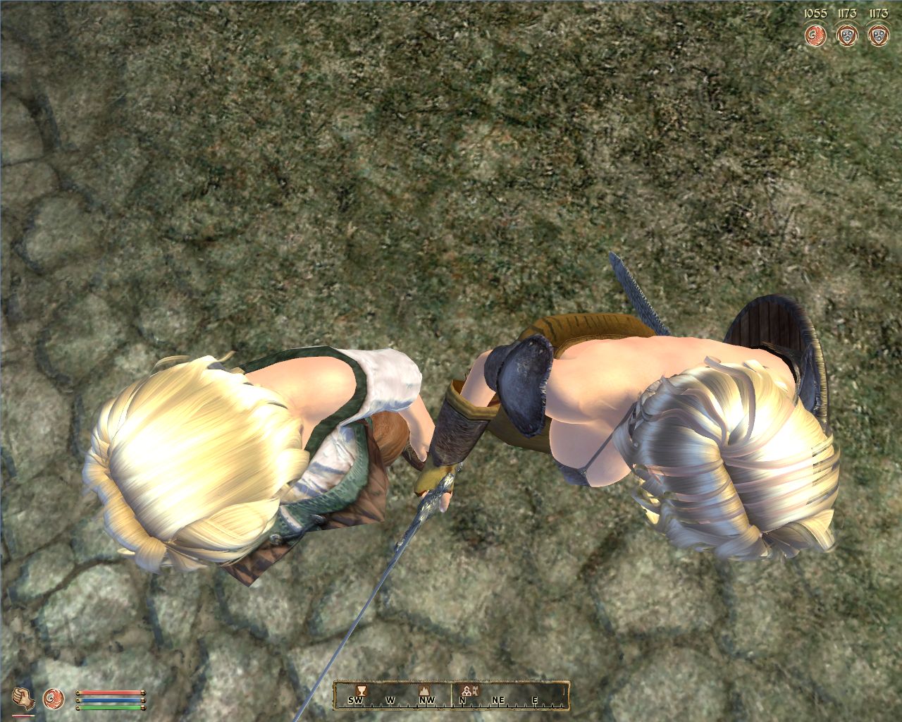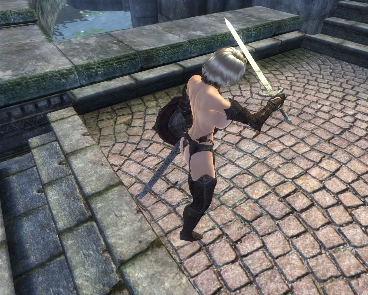 The first screenshot shows what's left of the neck seam. It's still visible, but far less than before. In the second you can see Cornelia's (Cornelius' ?) new 'assets'. What are you thinking? I'm of corse referring to the shiny steel armor composed by mixed stuff from Apachii Goddess Store, ANB Micro Bikini (resized to Manga upperbody) and standard issued steel boots and gauntlets. They look shiny just because of the APPLY_HIGHLIGHT diffuse method set in Nifskope.