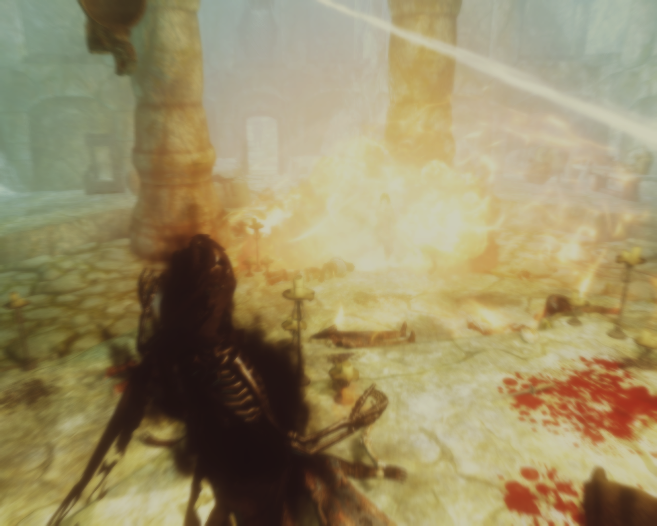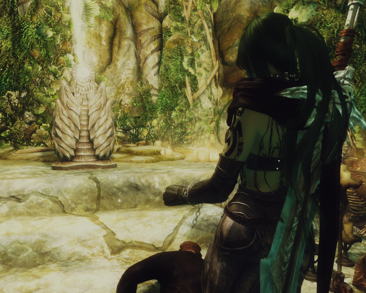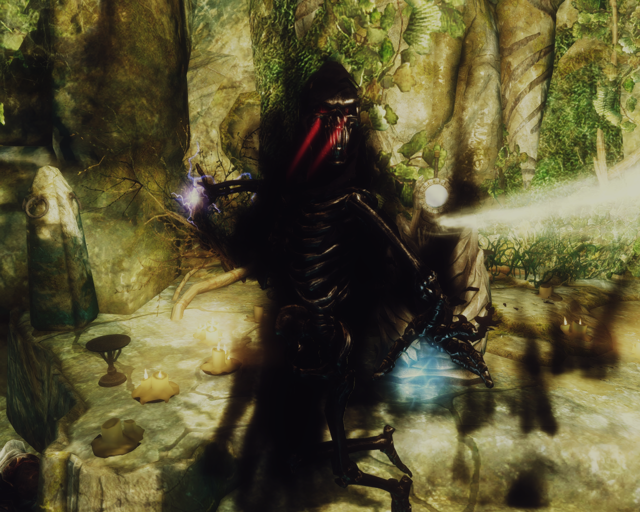 Umbra followed her through the door and closed it behind her. "Meridias temple and now shut up." Skana stopped at an altar where some strange orb was embedded in, emanating light beams in two directions, Umbra replied before Skana could even ask."You're undead, don't touch that. Unless you want to get disintegrated." That explanation was enough to let Skanas thoughts go haywire, if this is the temple to Meridia someone undead shouldn't be here at all. As they continued to walk through the small temple Skana got increasingly nervous.