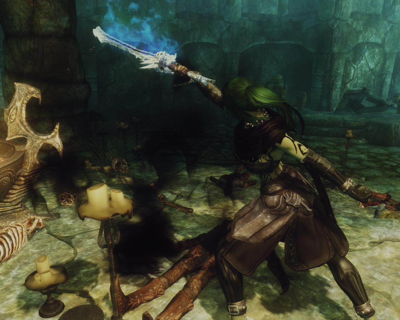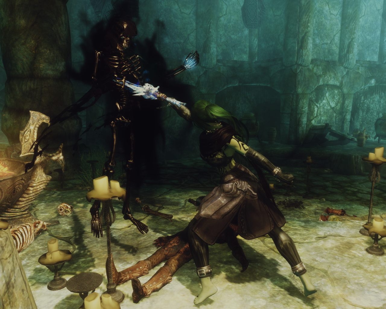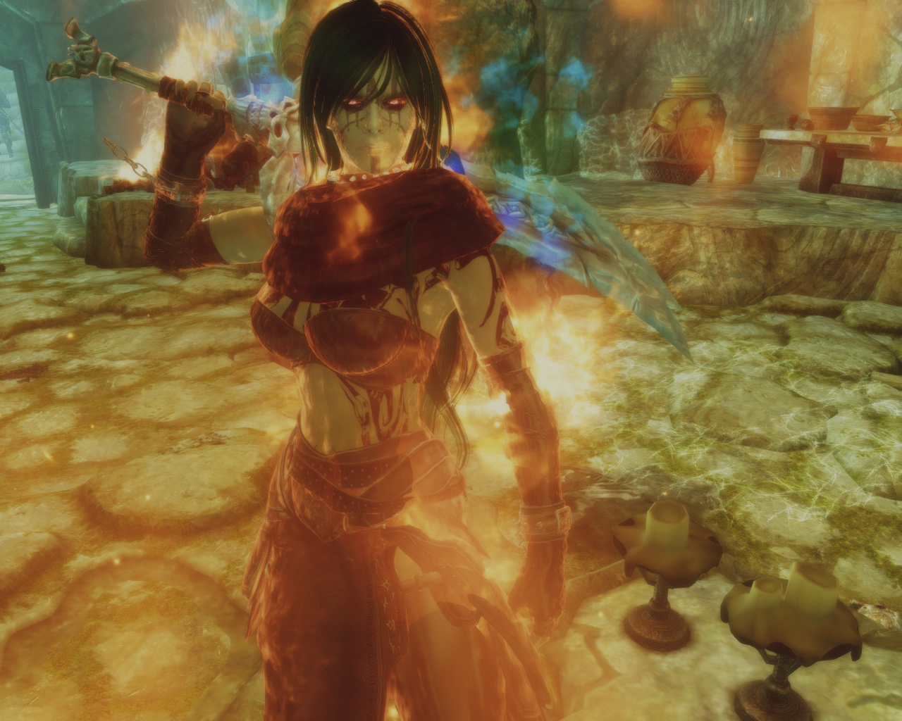 "So what's next? A chastity belt?" The unknown entity completely ignored Skanas snide remark and continued to speak."Your bindings were lacking, i corrected that. More important, i have a task for you, you are to destroy that miserable failure of a servant named Malkoran. He denies me his sworn service and pursues his own ambitions. One of my personal servants will accompany you and you will obey her every word as you obey mine." Skana turned around to leave the tavern and thought about how she isn't exactly keen on having a female dusty old draugr accompanying her.