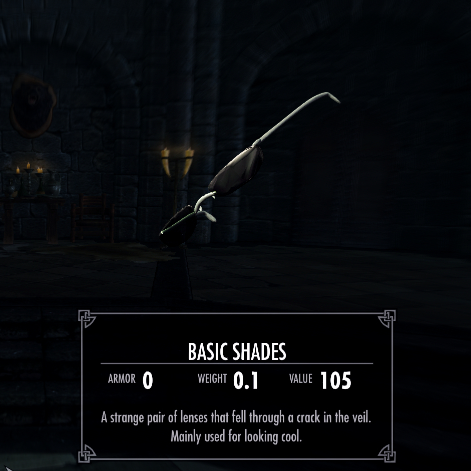 These are accessories made from scratch for Skyrim. Currently they consist entirely of a single pair of shades, but hopefully in time the list of items included will grow.