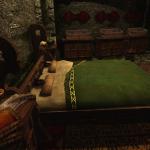 - Next to the bed is a small horker tusk, some oil, and "adult" books.