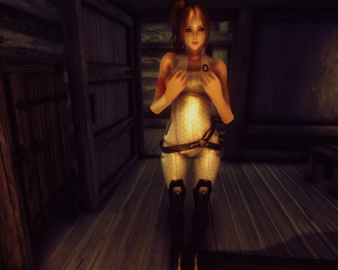 This time it's my dark-skinned 'Malou' partnering with the mod's NPC. The belt buckle has an 'X-Men' look to it.