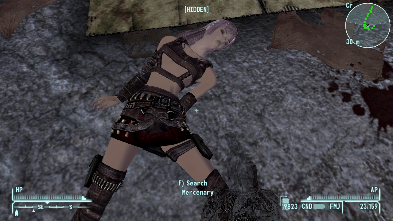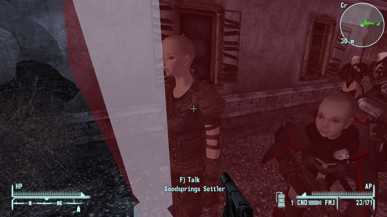 E6: And another non-glitched, though the Caravaneer sleeping beside her IS glitched. Also, please upload the NCR armors that you're using because while the soldiers inside the Mojave Oupost main building AREN'T glitched, I don't have the meshes/textures for the armors you assigned to them.
