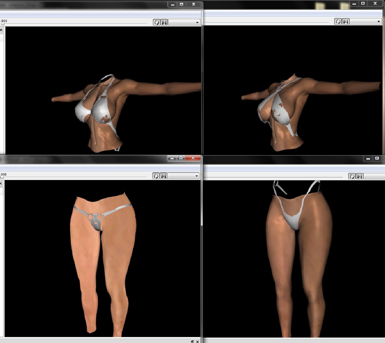 After a few attempts I've got the new mesh from the NPR M top and XWide bottom to what I'm sure is the light guts breast and ass. As any one can see by the picture above I'm having a few small issues where the bodies are clipping threw flesh. If some one can fix these 4 mesh I'll gladly do the leg work to edit the rest of the mesh for the other 32 outfits.