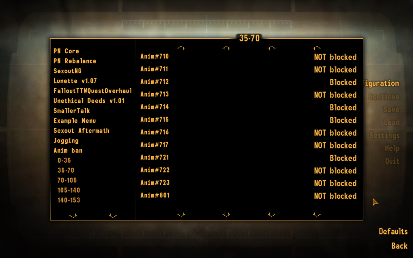 Content of black list will be dumped into console. Keep in mind that black list exists for each plugin and that for instance Sexout, ZAZ and Amra all have a #401 animation.When player is having sex press "Aim" button to see number of current anim playing