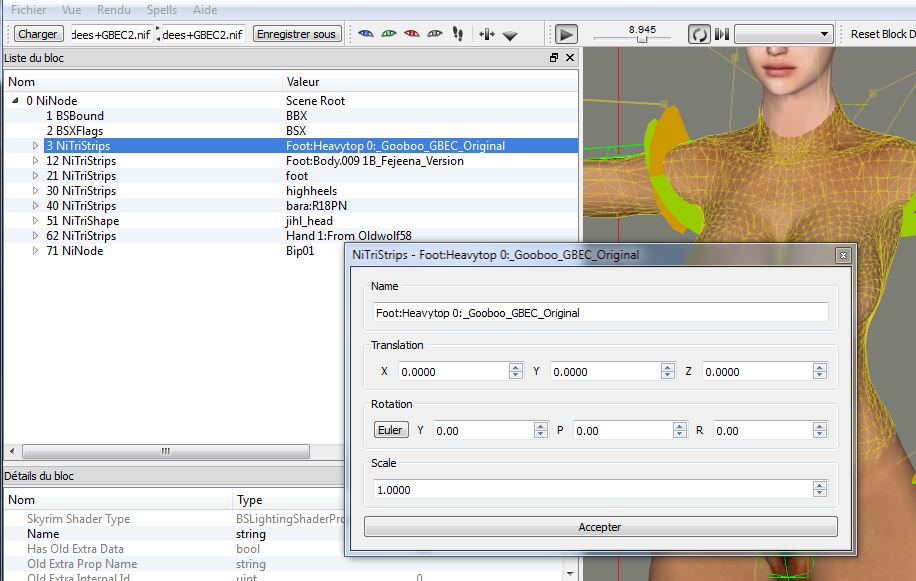 I was interrested by this "test" because i have in mind to write a tutorial ( as complete as possible) just for NifSkope but in a few language ... english ( i have no really a choice there ) , french, german , italian and spanish ....and probably russian too .