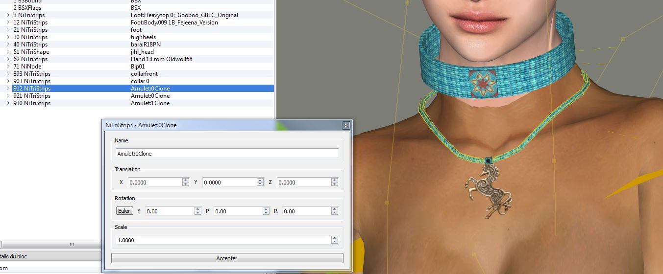 And as i said, once " corrected in cannot past this nif to a usual Skeleton ( Deedees, Vipcxj or LAPF ) without get a fully " distorded "amulet , so in this case no need to test it in game ... but i know one mode ( a clothing replacer where there is an error of rotation seen in NifScope but working without problem in Game so ...maybe ...