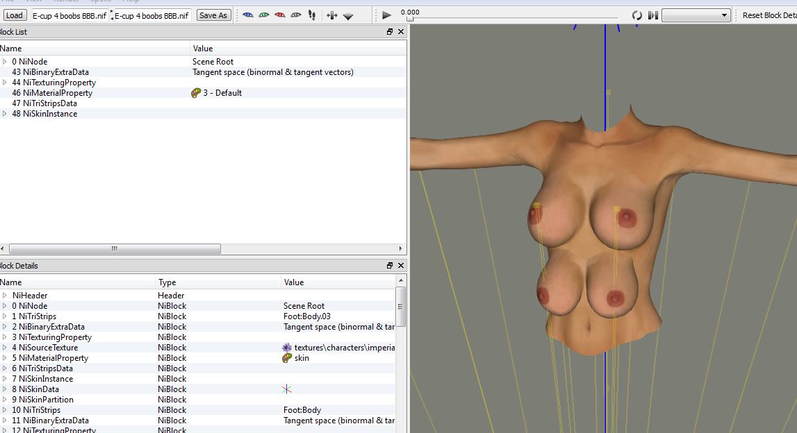 If you're sure it's a better/quicker way of attaining the same result, go ahead. I could try the Blender method, and then we could compare the results. I suspect that Nifskope is more precise, after all.Misunderstanding on my behalf. You're suggesting to import (in Blender) the block containing the HFB breast. It's another option, but I think DeadSomething is specifically interested in some E-Cup clothing or armor (haven't checked the links yet).