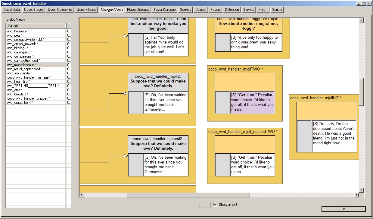 For this mod, all my dialogues are located in the coco_rwrd_handler quest.