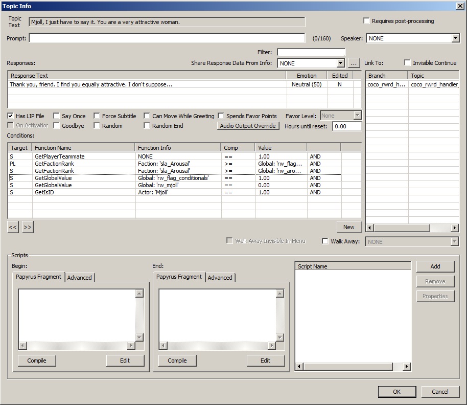 Dialogue is one of the easiest things to add to the game - here's the link again to some instructions for editing the mod yourself. A few more posts forward in the thread I talk a little bit about adding sex scripts, so just search forward. The above posted xml file should help you navigate (fingers crossed!) and figure out where things are - go ahead and add in those NPCs yourself if you want, but I'm way too lazy to do it.
