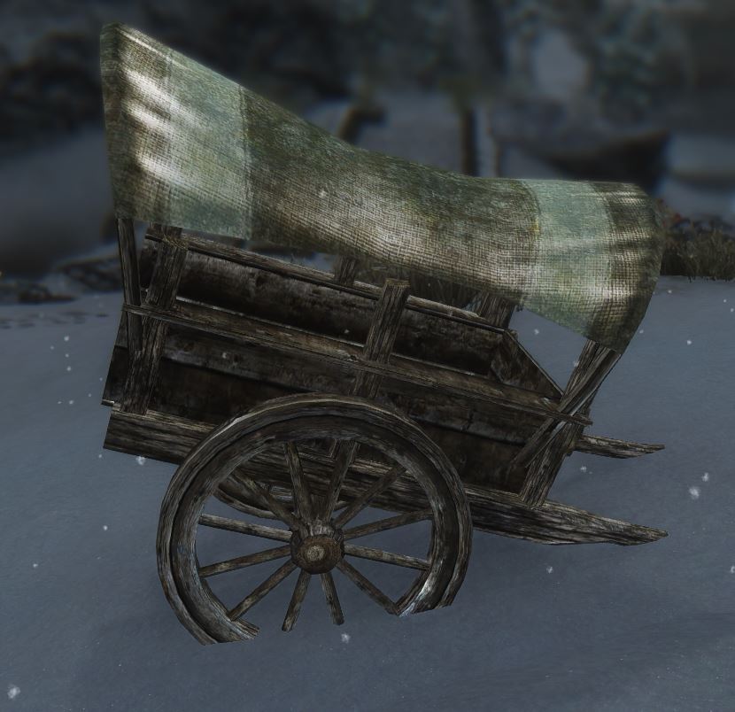 I think the current cart is bit oversized, there are two smaller carts in Skyrim, which would fit much better, i don't know if they can be converted for that job easily. Like that in the attachment.