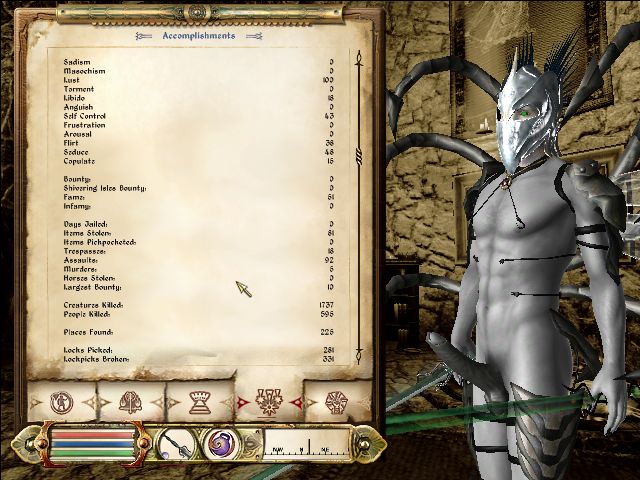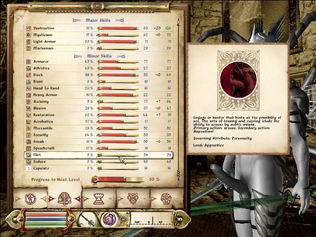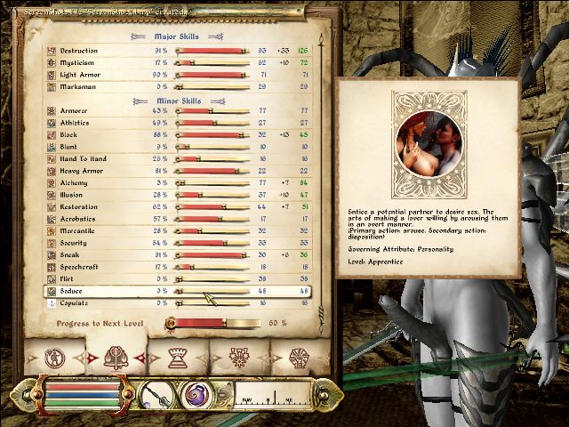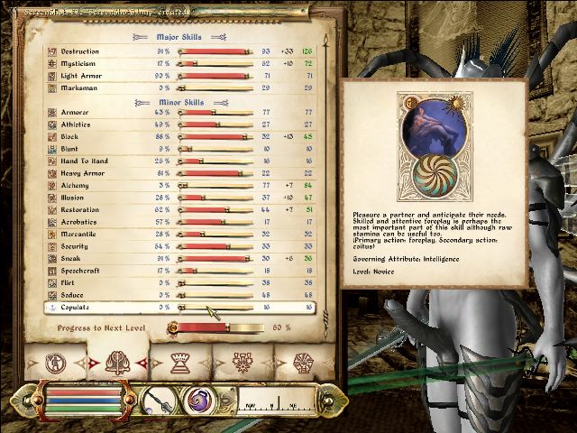 The OBSE dependencies will now include Blockhead and Menuque (to go with USV and AddActorValues). The ability to have custom skills and easier body transformations is just too powerful to ignore. My test characters now have Flirt, seduce and copulate visible in their lists of skills complete with mouse-over descriptions and graphics.