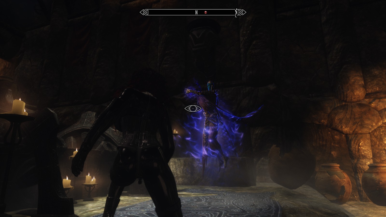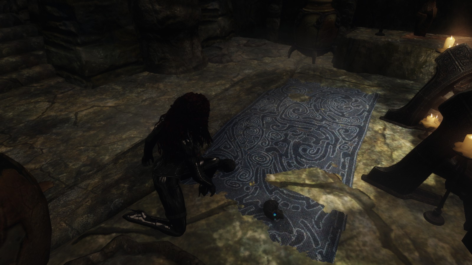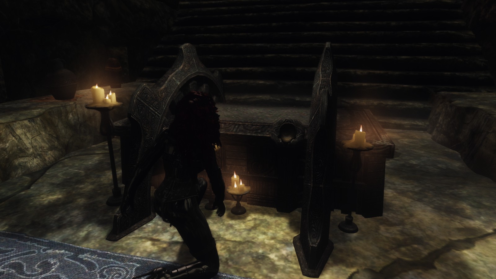 Confused as to where they came from, I picked one up to examine it. It wasn’t really a skull, merely a stone carved to look like one with elegant script engraved along its contours. Inset in the eyes were the two largest sapphires I had ever seen, so big that I couldn’t seem to take my eyes off of them. I couldn’t look away, and I couldn’t put the skull down, but a strange feeling passed over me and I knew that if I put both skulls on the sarcophagus, I’d be free. I was sure of it as I was sure that the Altmer were elitist bigots.