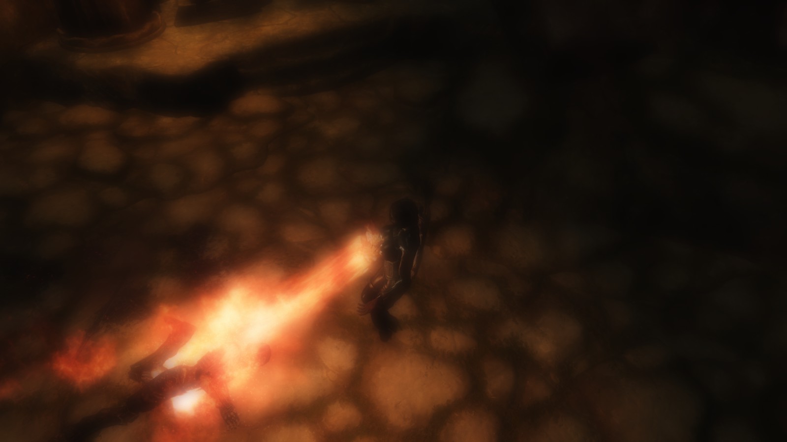 Composing myself once again, I look up to see through the faint view that I was afforded by my blindfold, that my fit had drawn the attention of one of the Barrow's residents. A hulking figure clad in ancient iron and crumbling leather comes charging at me with an ancient and deadly greatsword and it was all I could do to dive to the side, avoiding the blade by mere inches. I put some distance between us and allow my instincts to take over, bathing the foul creature in cleansing fire.