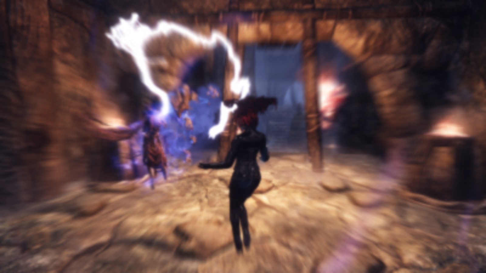 After quaffing my potion, I do my best shadow impersonation; creep around the lich and up the stairs. I’m so close that I can hear the humming of power and taste metal in the air. When I reach the top of the stairs, I feel every hair on my body rise and I turn just in time to look into the eyes of a storm. The lich had a bloody storm atronach! I scream. My veil collapses and I get blasted across the room with a bolt of lightning. As I’m sailing through the air, I have just enough time to realise that I actually did scream, and that I could actually feel things with my hands and feet. I must have found a way to get most of those devices off while I was in that daze earlier.