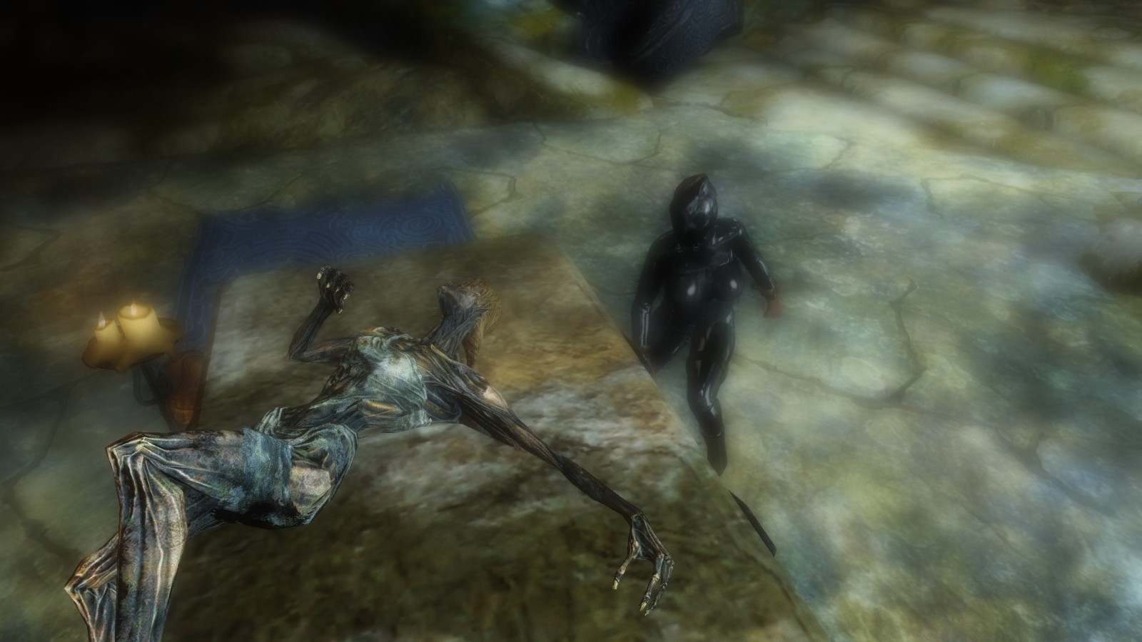 The place is cold, musty and feels like it was made from carved stone. I cautiously make my way forward, when my hand brushes aside what felt like a bone. A human (or Mer) bone. Feeling my stomach drop, I start investigating further and discover pots and urns weathered by time and neglect; books, waterlogged and rotting; and a hardened, leathery, mummified foot.