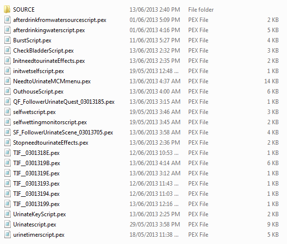 I might be updating this mod again in the coming week and here's a heads up on some possible new features. First and foremost, hot-keys. Instead of using the power, you can now use a hot-key. Second, the ability to check your bladder fullness. (I should've had this to begin with.). These two features are definitely gonna be in the next version. The remain three features may or may not. Third, asking companions to urinate. Companion will be using a much simpler timer script. Fourth, going number two. I've set my mind on adding this, so it only a matter of when it will be added. Fifth, going to attempt and integrate this with RnD again. The main problem with RnD is that my plugin can't refer to RnD's since it's also a plugin rather than a master. I hope someone can help me with this.