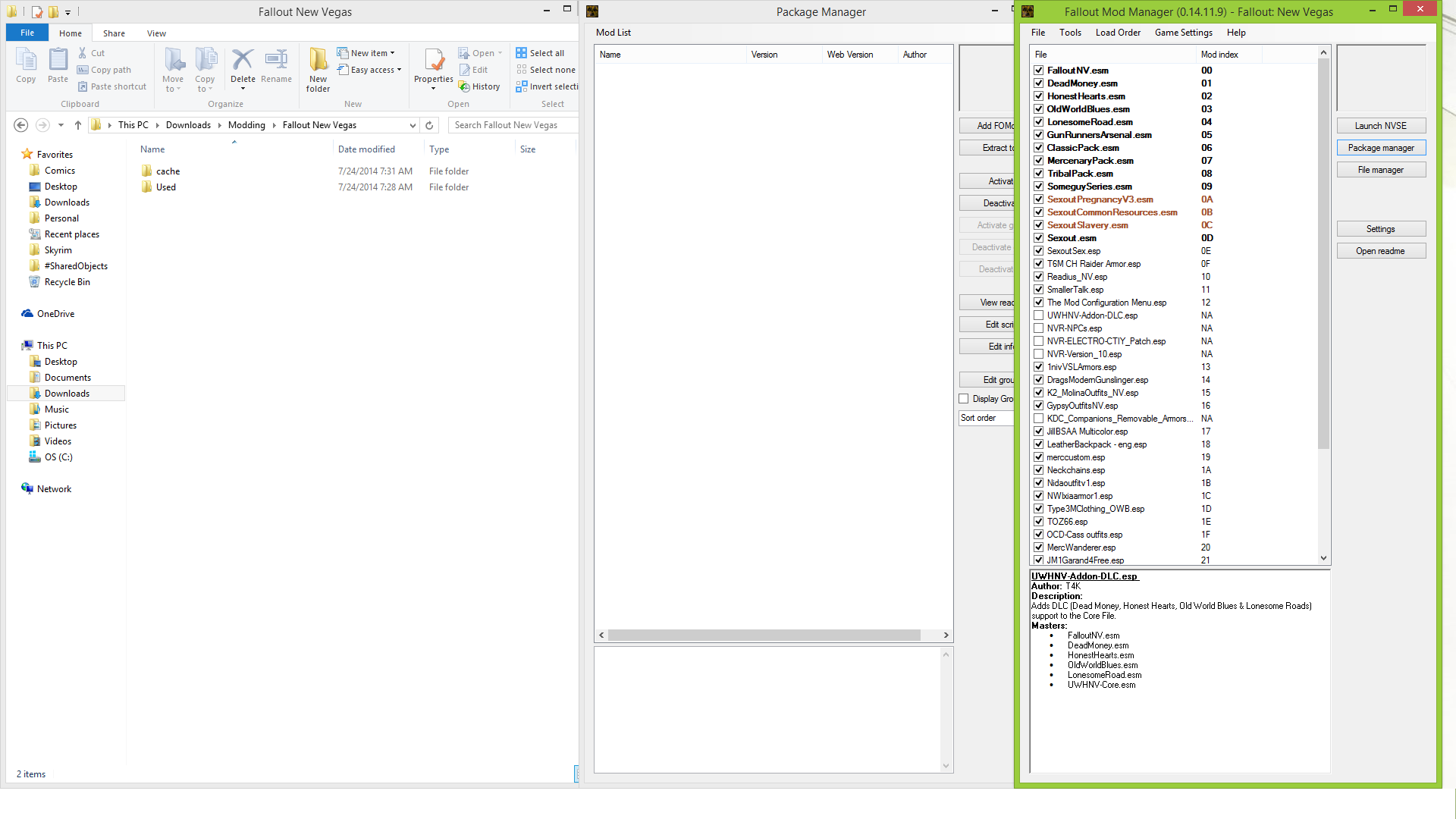 The only thing I may have done differently concerns where FOMM saves mods. I've always used the default, but this time I'm using the same folder that I use to download mods initially, which I suppose is why "cache" is there. I don't touch that folder though, so I'm not sure why that'd have any impact here? I also wasn't aware that folder had any impact on what happens in-game, but I'm not really qualified to speculate on any of this.