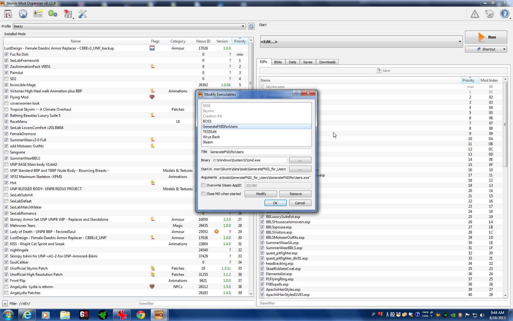 C:\Program Files(x86)\Steam\SteamApps\common\Skyrim\data\tools\GenerateFNISforUsers.exe. Start in C:\Program Files(x86)\Steam\SteamApps\common\Skyrim\Mod Organizer