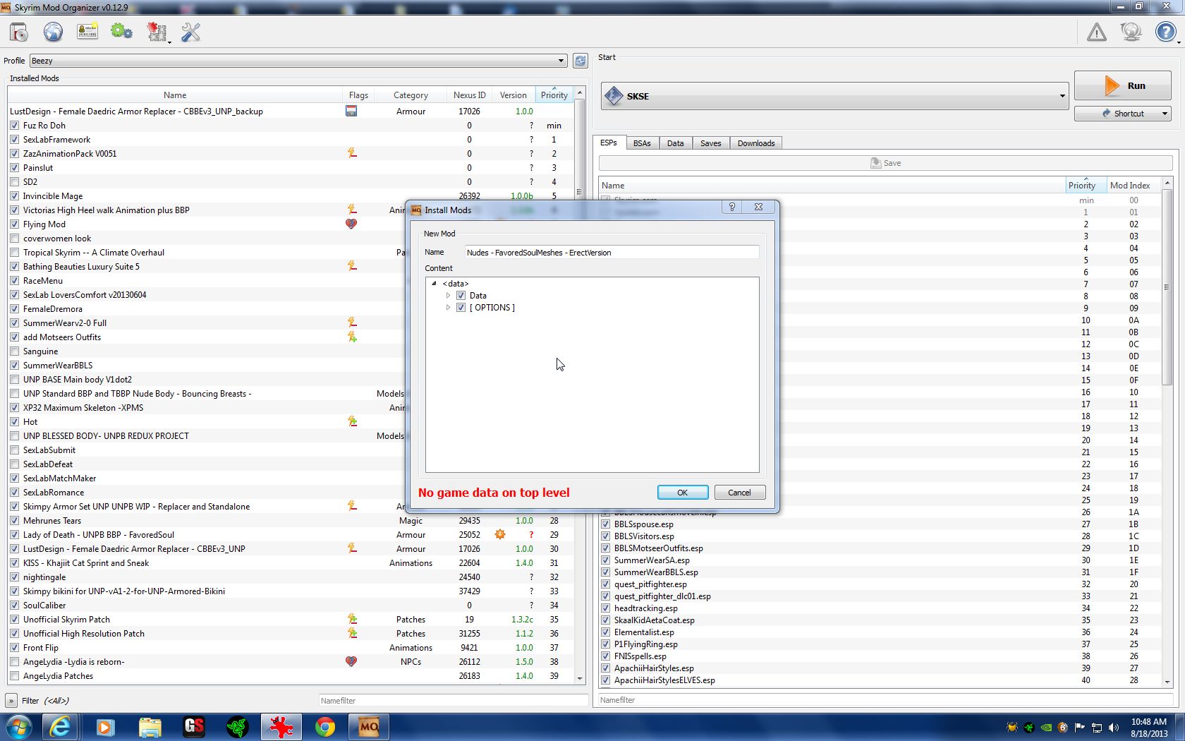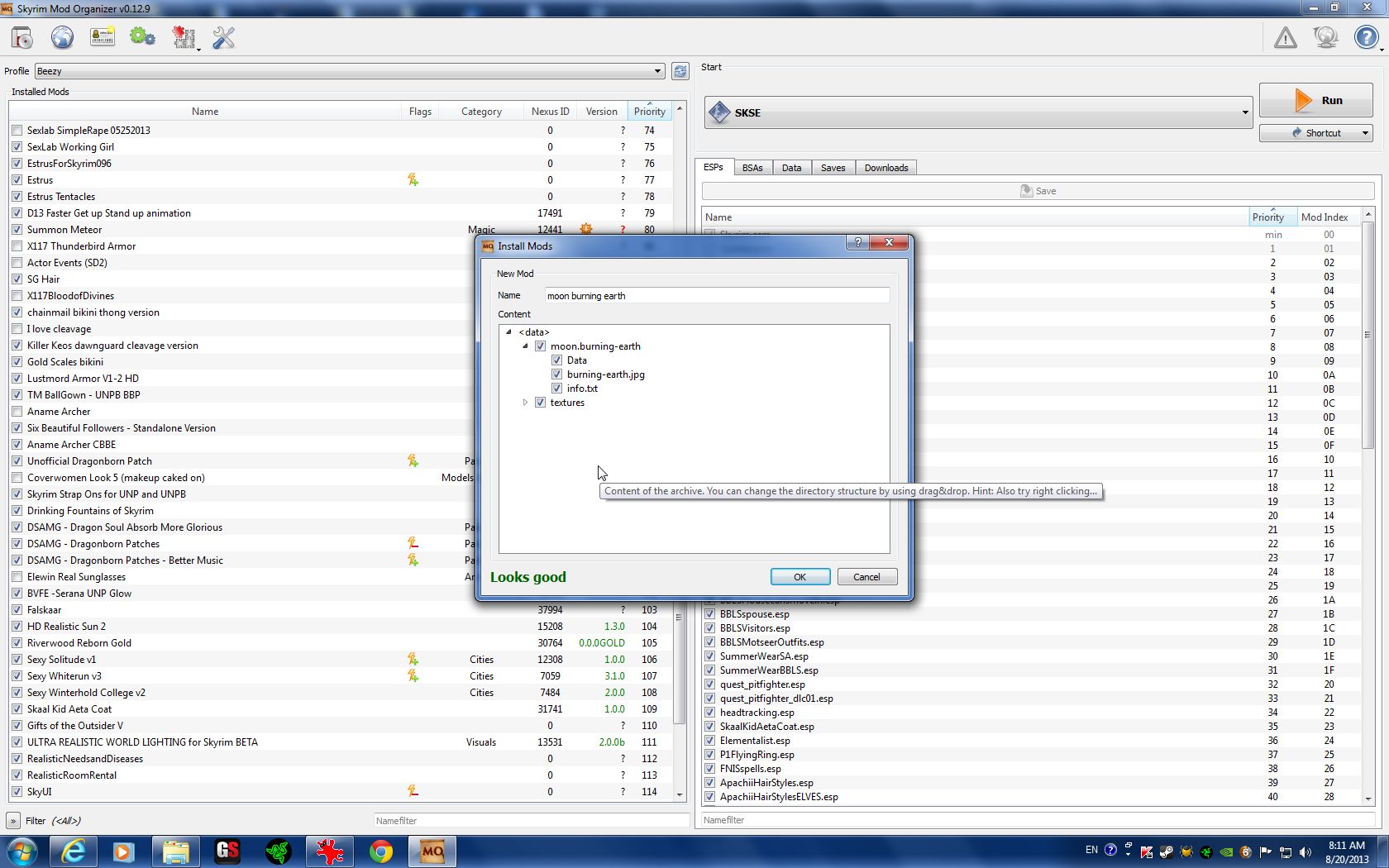 This is what it looks like when I download a mod from my desktop folder (where I download all my mods) to my MO: post-111270-0-20142100-1377000761_thumb.post-111270-0-93998000-1377000773_thumb.post-111270-0-15045600-1377000785_thumb.post-111270-0-86238300-1377000792_thumb. You just gotta love this thing! B)