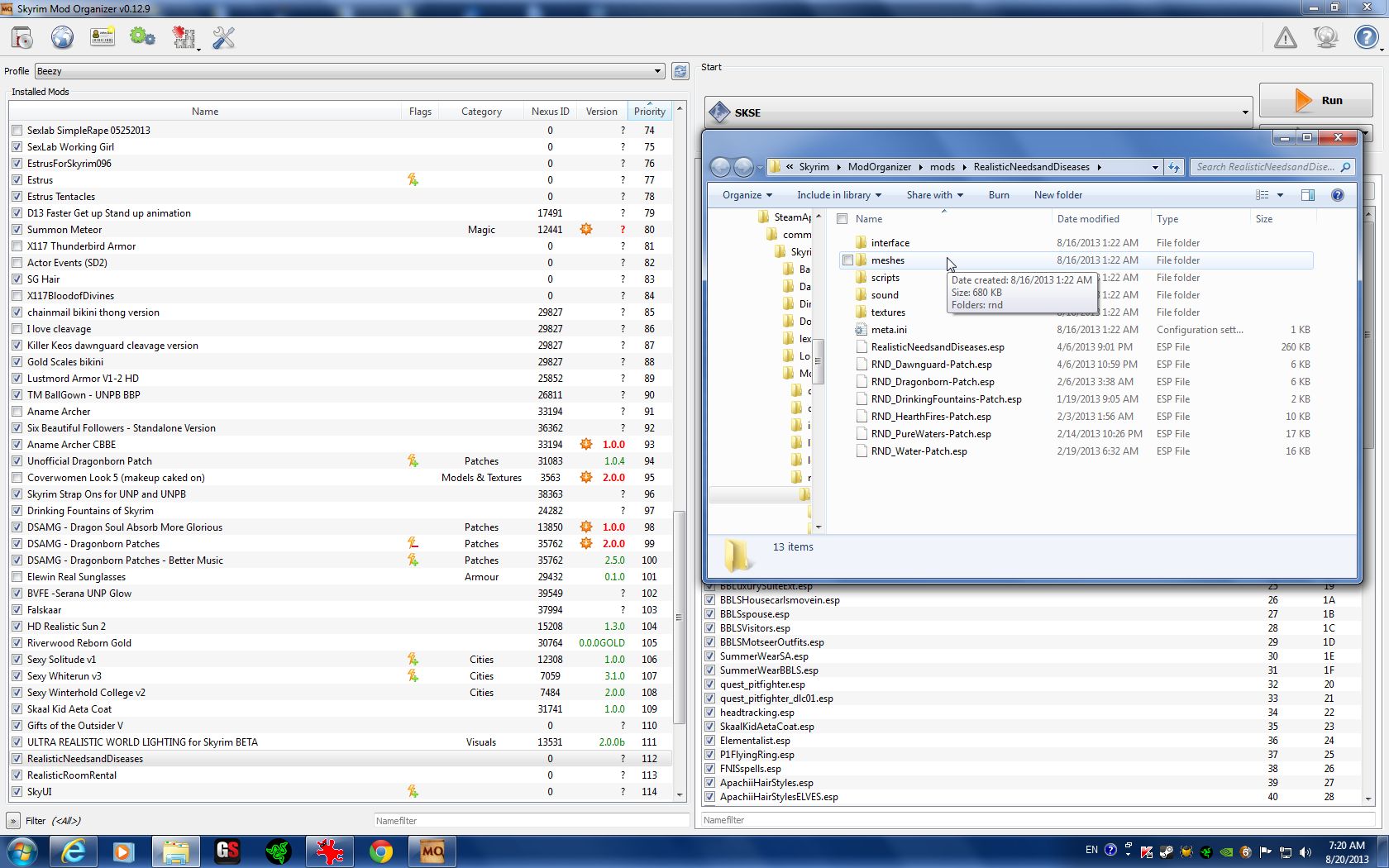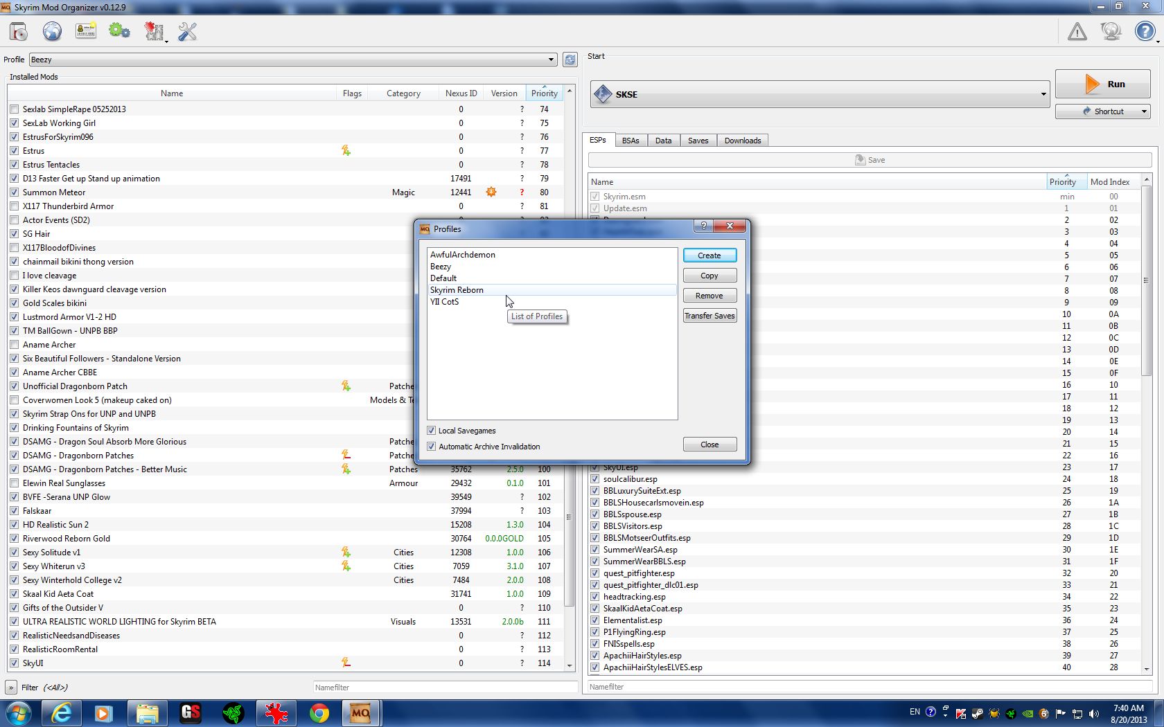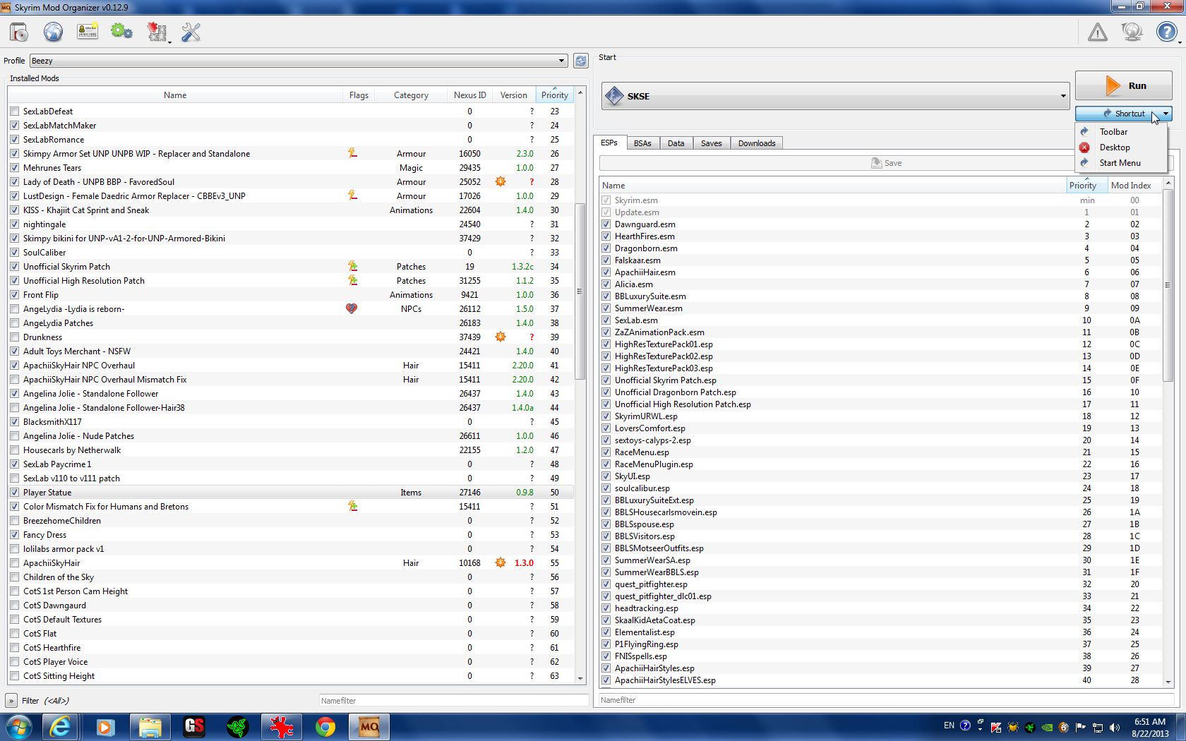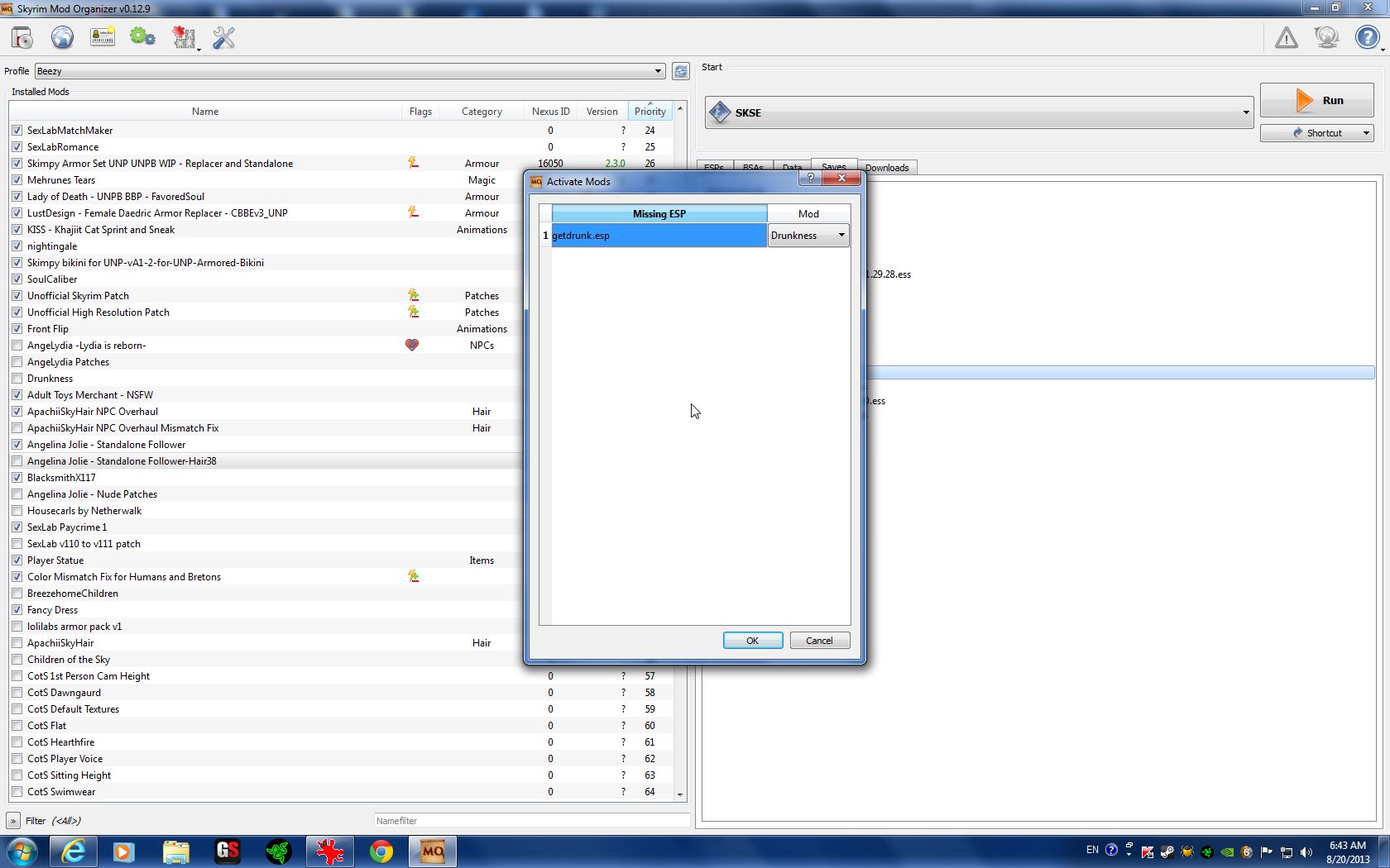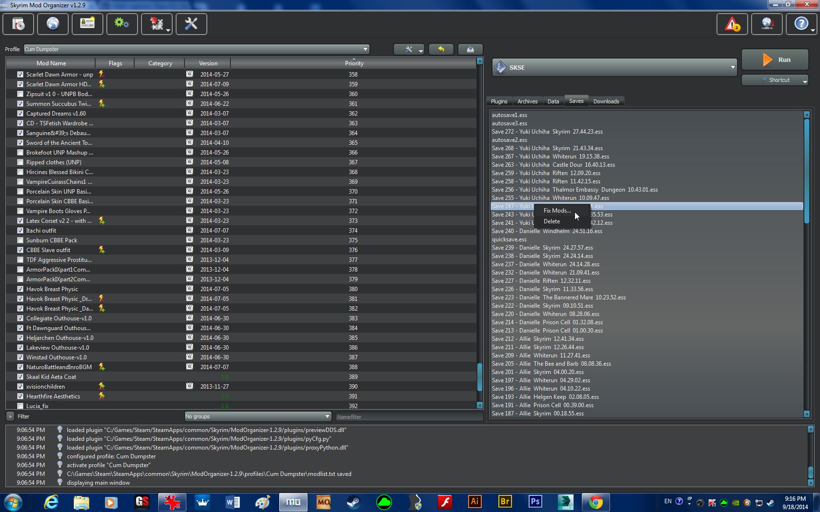 When you save your game, you also save the mod set-up you were using when you saved. This means that you can locate your save, right-click, and choose "fix mod", thus reactivating the mods you were using when you made that save! post-111270-0-92622200-1376995744_thumb. Is there anything Mod Organizer can't do?