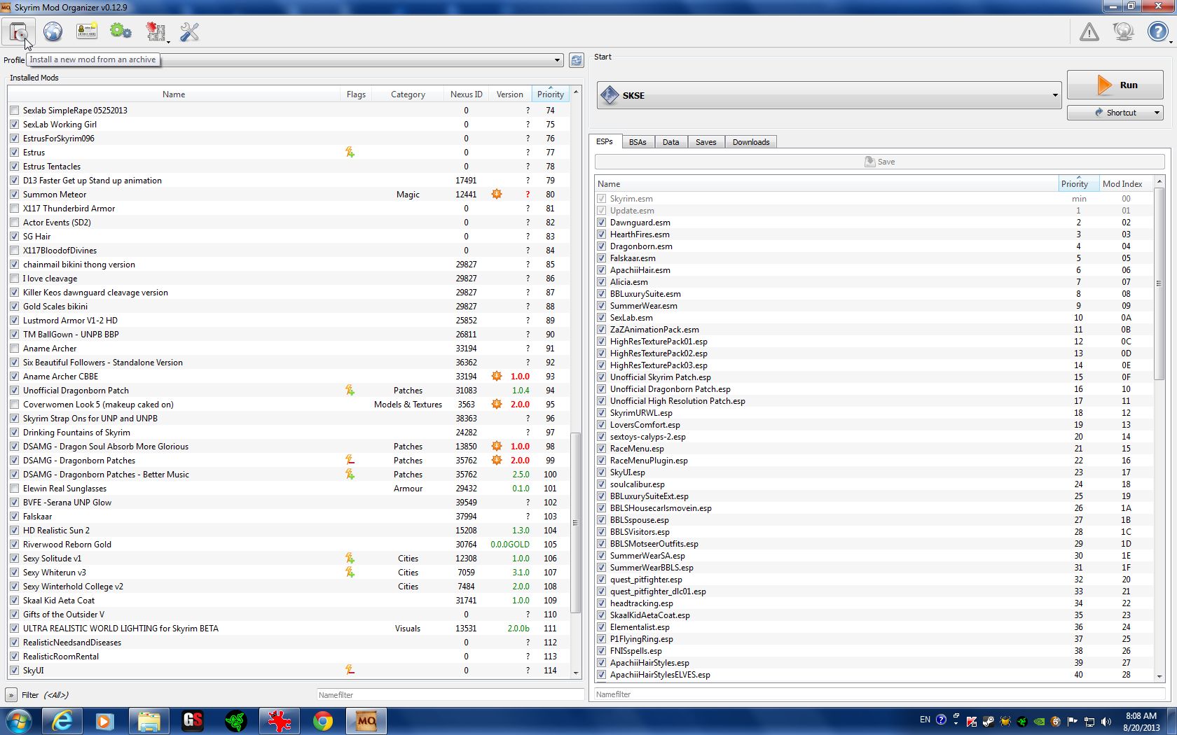 So, before a ton of people start asking, [Disclaimer] NO, the mod named "SD2" isn't actually SD2. That mod hasn't come out yet. Yes, I know it "says" SD2, but you can name mods whatever the f*** you want in MO, and I've chosen to name SexLab SD 'SD2', so NO, it's not the awesome sequel to the magnificent Sanguine's DebaucheryTM.