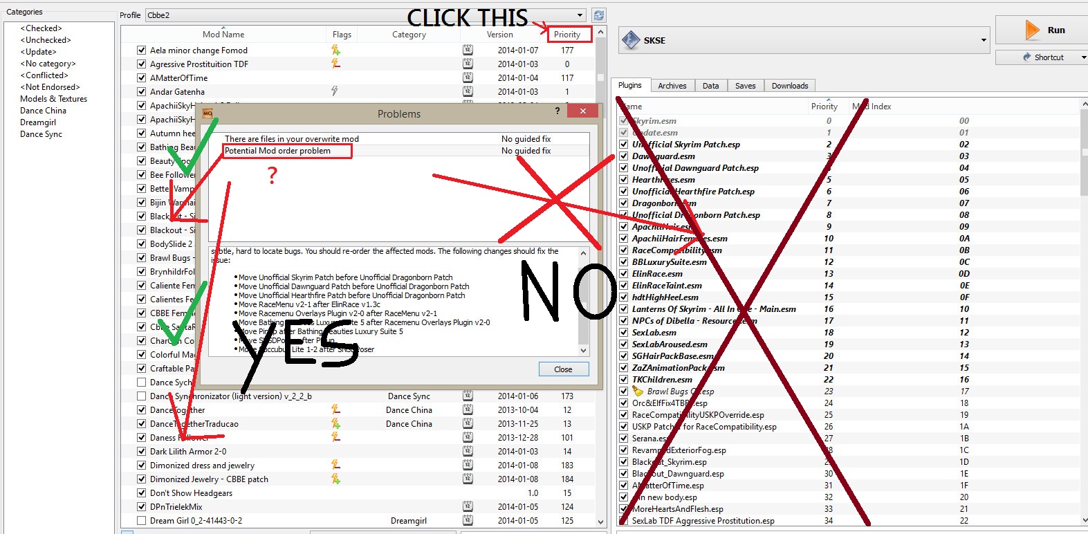 Actually, it looks like you have the right setup, as far as I can tell. I s there anything on MO's error list that you haven't moved? You know, move this before that, put that before this...? Maybe you found a bug. Not impossible, but you load your Unofficial Patches just like me. It might just be giving you troubleshooting tips based simply on the mods you have installed, since it says 'no guided fix'.