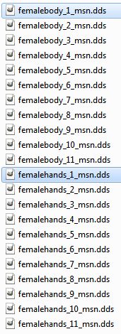 *) each of femalebody/head/hands .dds, _msn.dds, _s.dds, _sk.dds