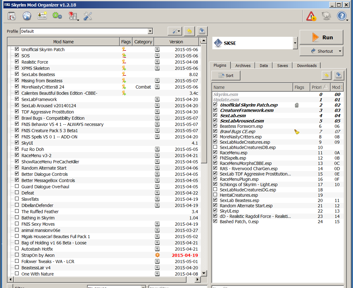 Here is a minimal list of mods I consider important for a very sexual Skyrim game.  The interface is Mod Organizer, and while it took some time to become familiar with it's basic use, it was well worth the time.  I don't claim to be a wiz, but I can use it for quickly changing the order of mods that have files that will overwrite files in other mods so that the best version is the one that gets final use.