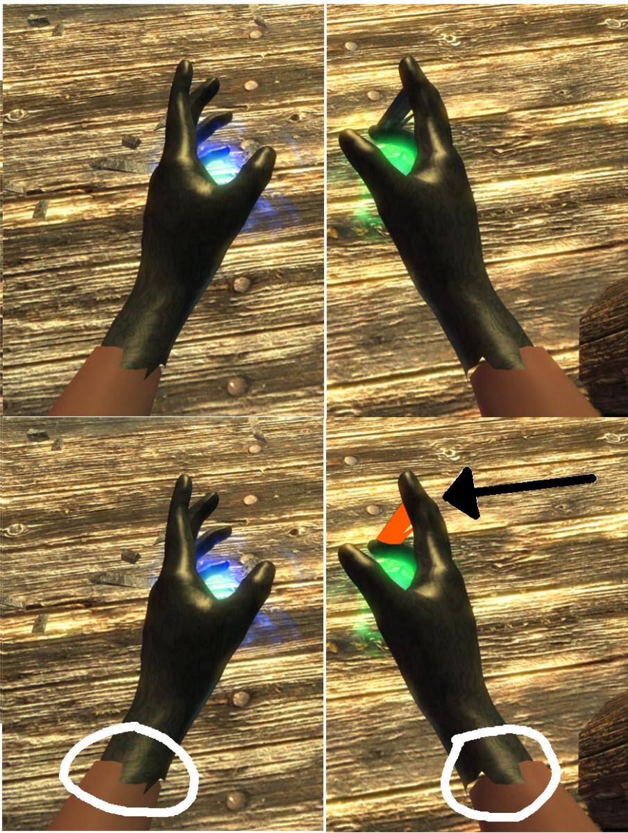 The right latex glove has some webbing in between the fingers.