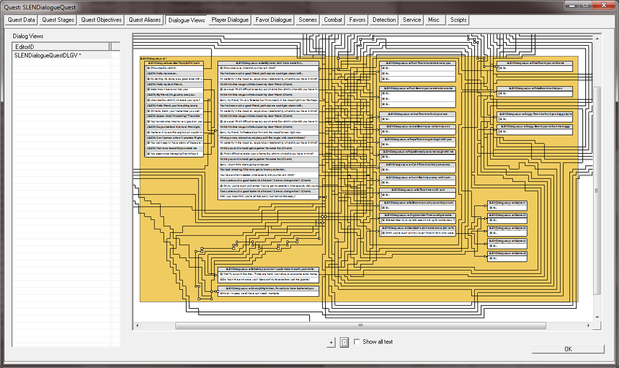 If you really want to see you'll have to make a dialogue export of the SLENDialogueQuest quest in the esp, the CK is not able to display this spaghetti mess in a readable way.