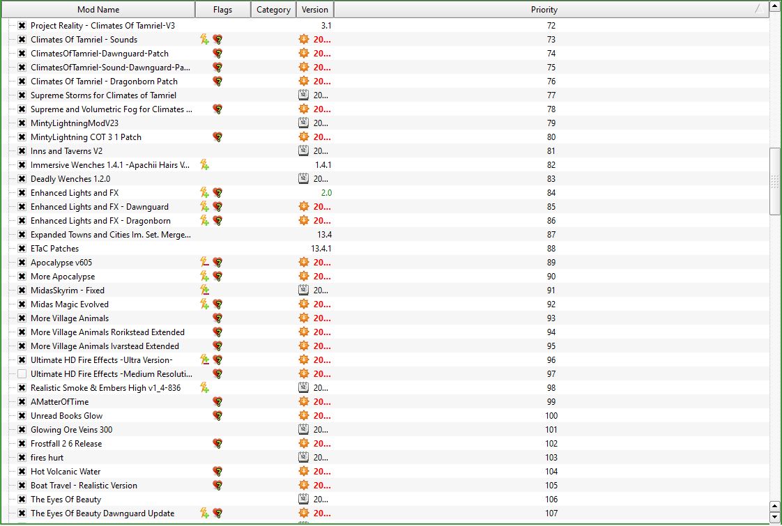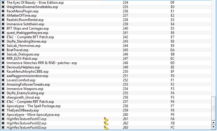 Your Hi-Res Textxure Packs should also be high up your load order - the brush symbol beside them also means that if they're ticked under the 'Archive Tab' they don't need ticked in the plug-in list (you have to let MO manage archives - there's a tick box for this when you open the 'Archive' tab)