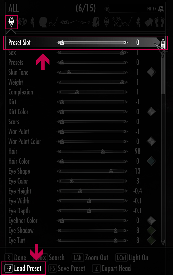 Loading a preset in the game