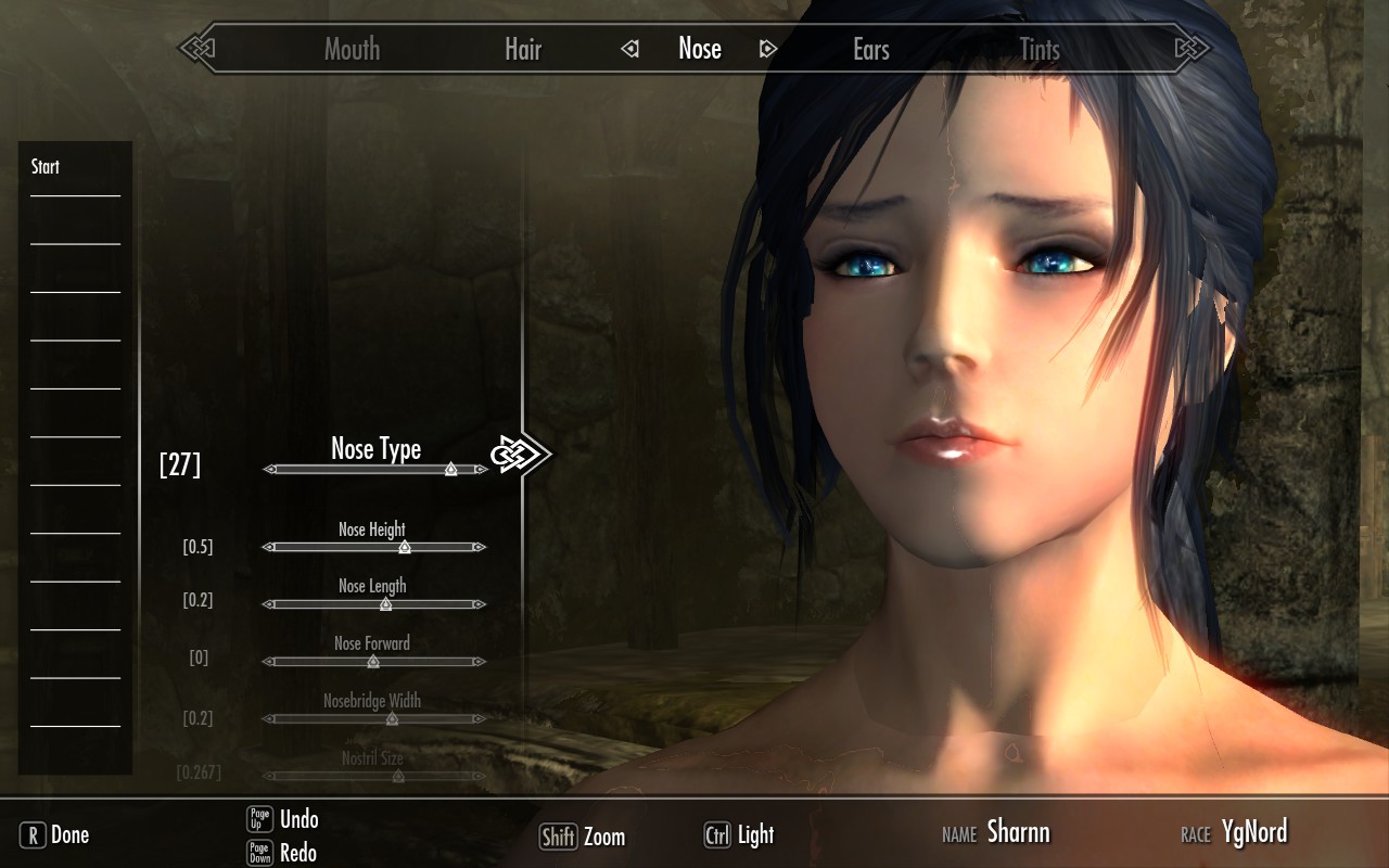 As you can see, she's a Breton, but somewhat darker in tone. I like to think of her as a Breton/Redguard offspring. Same as my last Breton character, actually, but tweaked a little.