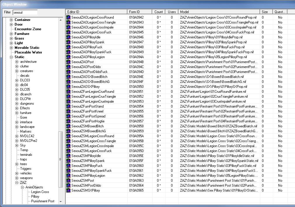 The sitting issue is not new. I've never reported it because I thought it was a known issue' date=' but I've had weirdness involving starting sex with someone sitting down ever since I first started using sexout. I think its a gamebryo issue because I had the same problem with wsex and ap.